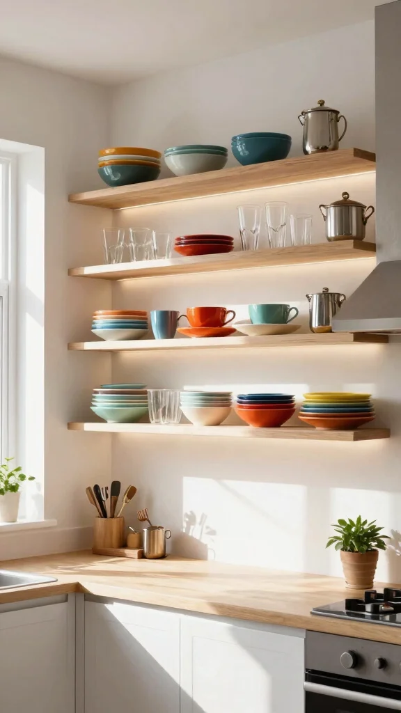 Embracing vertical space is essential for small kitchens, and open shelves serve as a stylish solution. By positioning shelves above your countertops, you create a blend of practicality and aesthetic appeal, showcasing your favorite kitchen items while keeping essentials within reach. Imagine displaying colorful dishware or neatly stacked cookbooks against a warm backdrop of painted walls or natural wood finishes. This design element not only maximizes storage but also enhances your kitchen’s character and warmth.