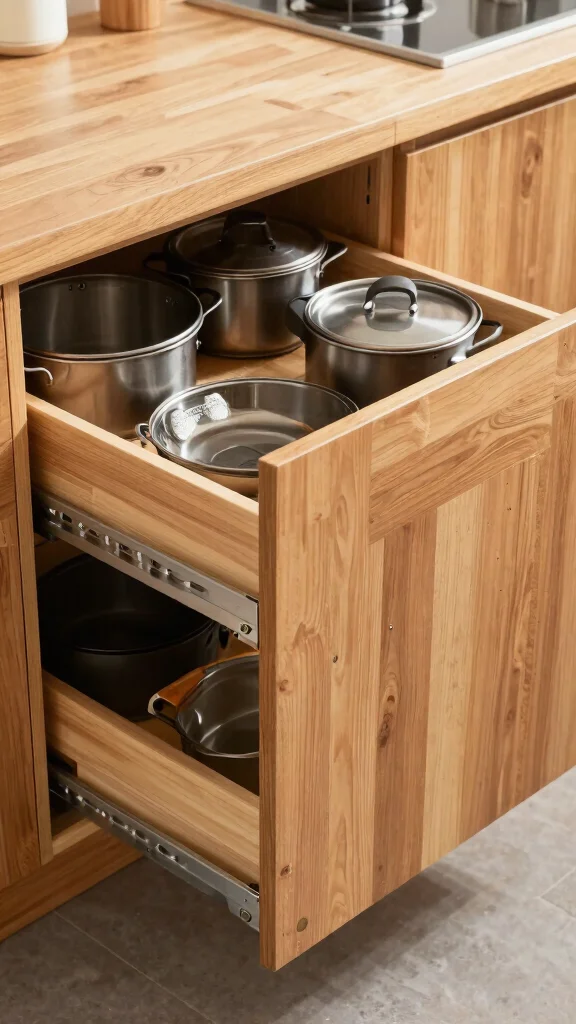 Pull-out drawers are a game-changer for maximizing storage in small kitchens, especially within cabinets. These drawers allow you to store pots, pans, and pantry items with ease, eliminating the hassle of reaching deep into cabinets. Imagine being able to slide out a drawer to find exactly what you need without any digging or clutter.