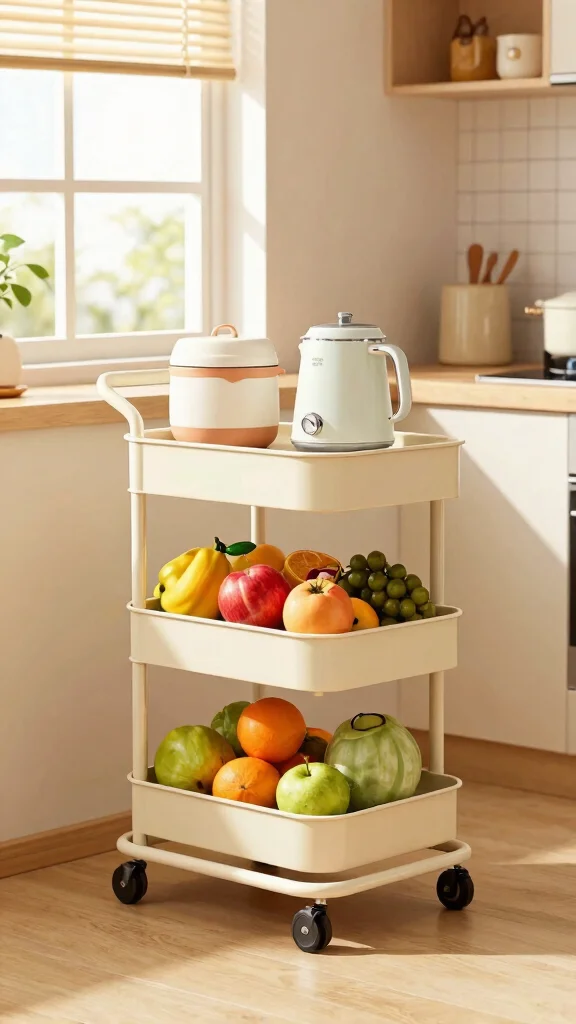 This simple yet effective solution enhances your kitchen’s efficiency while adding a playful charm. The rolling cart’s versatility and style make it a must-have for any compact kitchen.