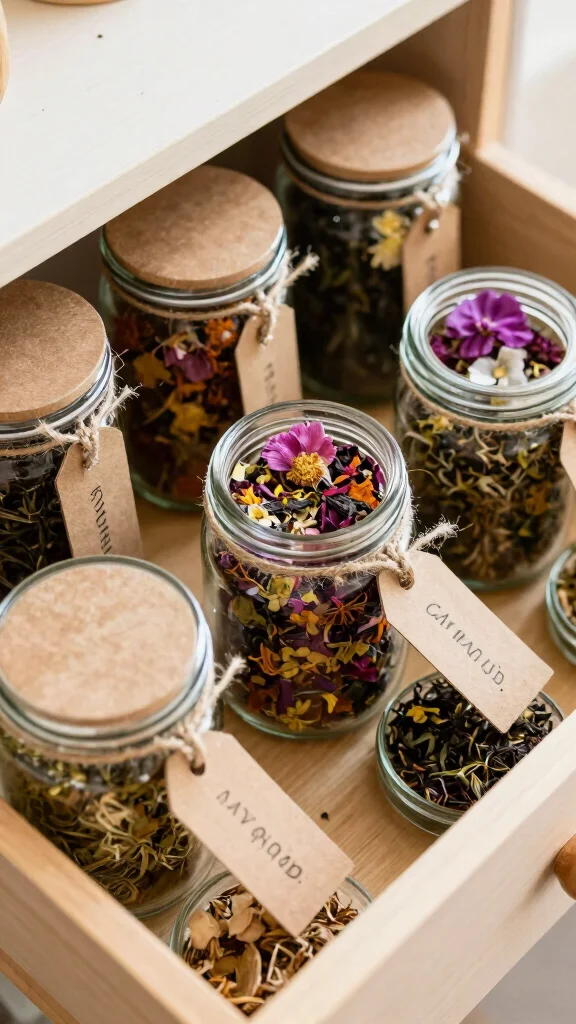 This approach not only preserves the freshness of your teas but also promotes an eco-friendly lifestyle by reducing waste. Consider arranging your jars on a small wooden tray for an extra cozy feel. You can also mix and match sizes for visual interest while keeping everything organized.