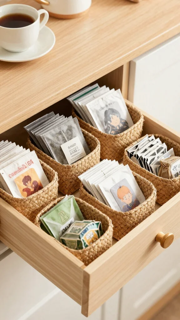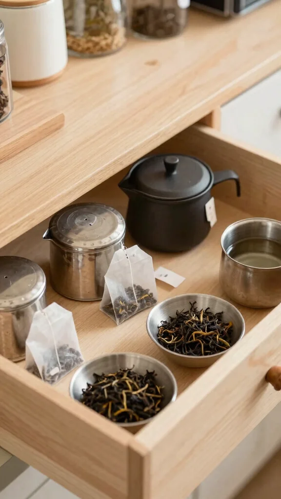 Implement layered storage for tea bags and accessories to maximize space and keep everything organized and accessible.