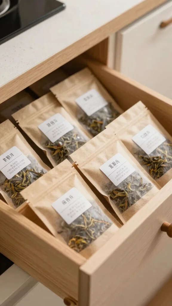 Group teas by type (green, black, herbal) and use adjustable dividers so you can resize as you add flavors. Swap disposable bags for loose-leaf with a reusable infuser, and store backups in compostable pouches or more jars. Label everything with chalkboard or engraved tags to keep the look cohesive and practical. This approach hits tea storage solutions, kitchen organization tips, and functional home decor all at once.