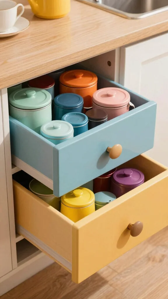 Infuse your tea drawer with a lively color-coded organization system. Grouping different types of tea by color not only enhances visual appeal but also makes it easier to find what you’re looking for. For instance, use green containers for green teas and earthy tones for herbal blends, creating a vibrant display every time you open the drawer.