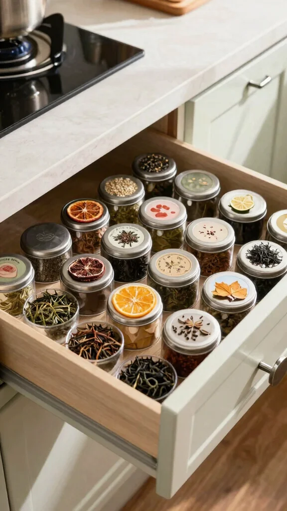 Using clear containers for your loose-leaf teas not only organizes your collection but also showcases the beautiful colors and textures of the leaves. Opt for glass or acrylic containers that seal tightly to preserve freshness, giving your tea drawer a modern yet cozy aesthetic. The transparency allows you to appreciate the vibrant hues of your teas every time you open the drawer.