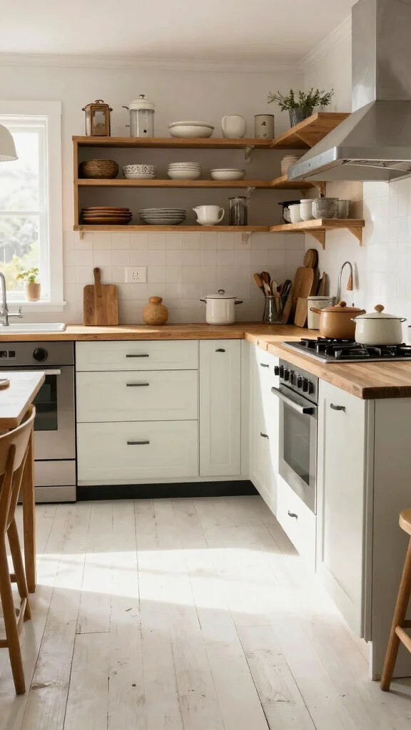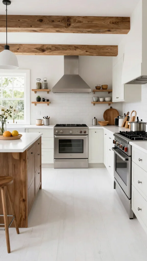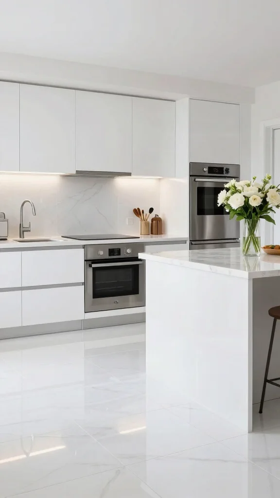 White floors can actually make small kitchens feel larger and airier. The reflectivity boosts perceived space and pairs beautifully with white kitchen design elements for a true minimalist look. To keep it balanced, add texture through countertops, backsplashes, or a wood or metal accent that doesn’t compete with the white floor. Use consistent grout and tile sizing to avoid visual busy-ness, and consider open shelving or glass-front cabinets to maintain light flow. In open-plan spaces, carry the white kitchen design through adjoining rooms for a cohesive feel that keeps the area feeling clean and unified.