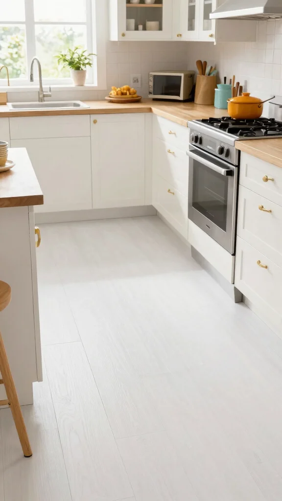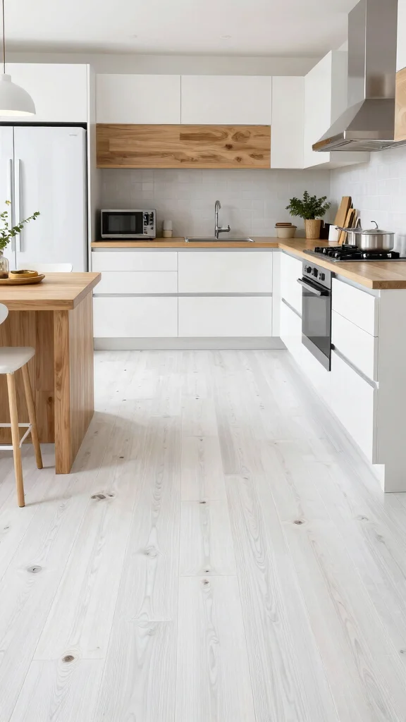 Fun Fact: Bright white bamboo floors are not only stylish but sustainable—bamboo regrows quickly, cutting your footprint by up to 30% compared to traditional woods. Seal properly to resist moisture in a white floor kitchen, then blend natural wood for harmony.