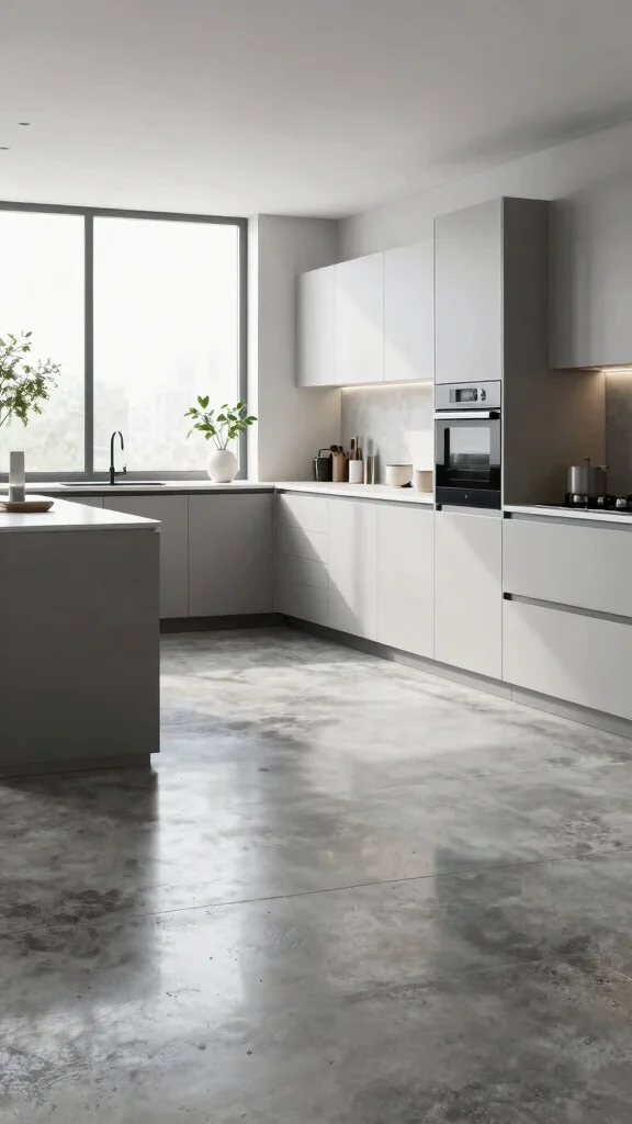 Polished concrete floors present a chic industrial vibe that suits modern kitchens perfectly. This durable material is customizable in various shades of white, making it an excellent choice for a sleek look. Not only does polished concrete offer a contemporary aesthetic, but it is also highly resistant to spills and easy to clean.