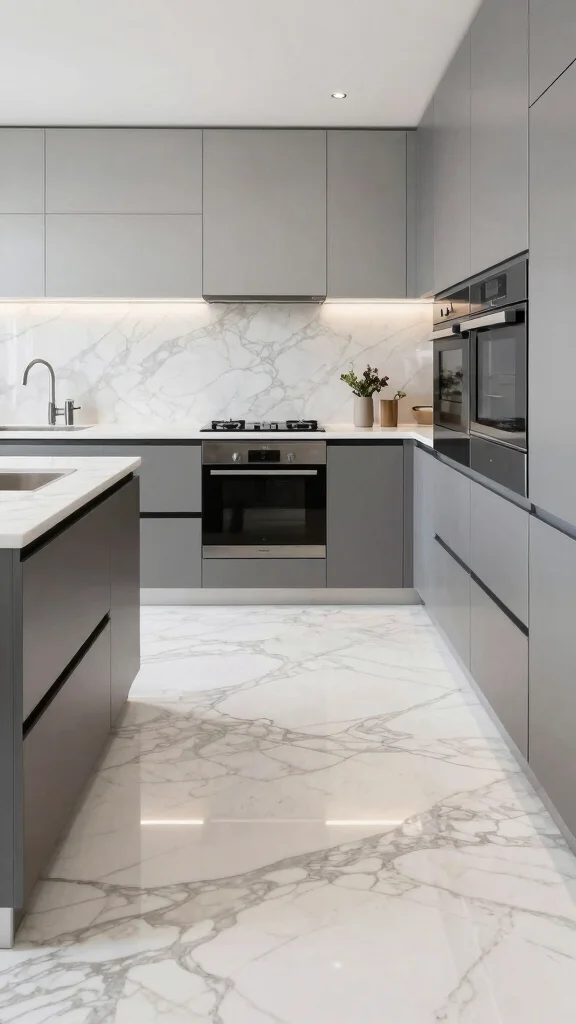 The material of your flooring greatly affects the kitchen’s overall look and function. Options like glossy tiles, polished concrete, or elegant white marble each bring unique aesthetics and durability. For instance, glossy tiles can reflect light and create an airy feel, while polished concrete offers a more industrial vibe. Think about your kitchen’s style and how each material fits into your vision.