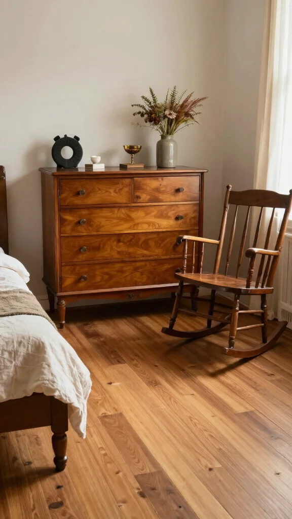 Incorporating vintage finds into your bedroom decor introduces history and character, beautifully contrasting with the warm wooden flooring. Explore thrift stores or flea markets for unique pieces, such as an antique dresser, vintage mirrors, or a classic rocking chair.