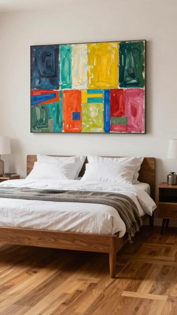 Art can spark conversations and reflects your personality, transforming your bedroom into a true sanctuary. Position larger pieces above the bed or along empty walls, ensuring they complement the warm tones of the wooden floors and surrounding decor.