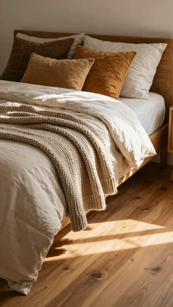 Cozy is a choice you make daily. Layer warm throws and cushions in varied textures on your wooden floor bedroom to invite relaxation, while mixing sizes and patterns creates a lived-in, inviting space you’ll want to linger in.