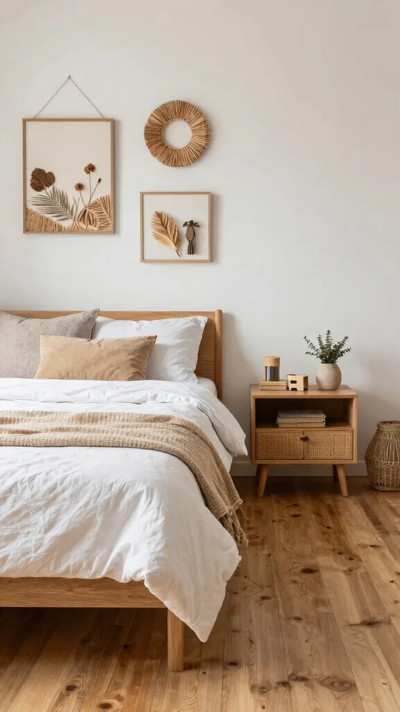 Use wooden shelves to display greenery, framed photos, or meaningful artifacts. Additionally, consider incorporating stone elements like decorative vases or textured sculptures to elevate the visual appeal. These natural elements work in harmony with your wooden floors, enhancing the cozy vibe of your bedroom.