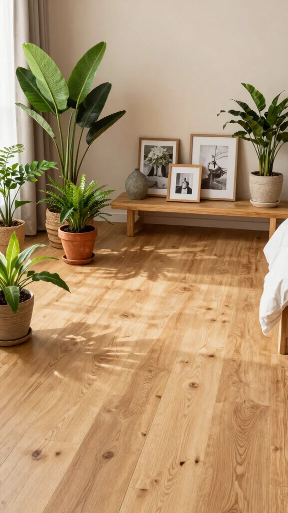 Bringing natural elements into your wooden floor bedroom creates a soothing sense of tranquility. Integrate plants, wooden decor, and stone accents to connect your space with the outdoors. Not only do plants purify the air, but they also add vibrant life and color to your room.